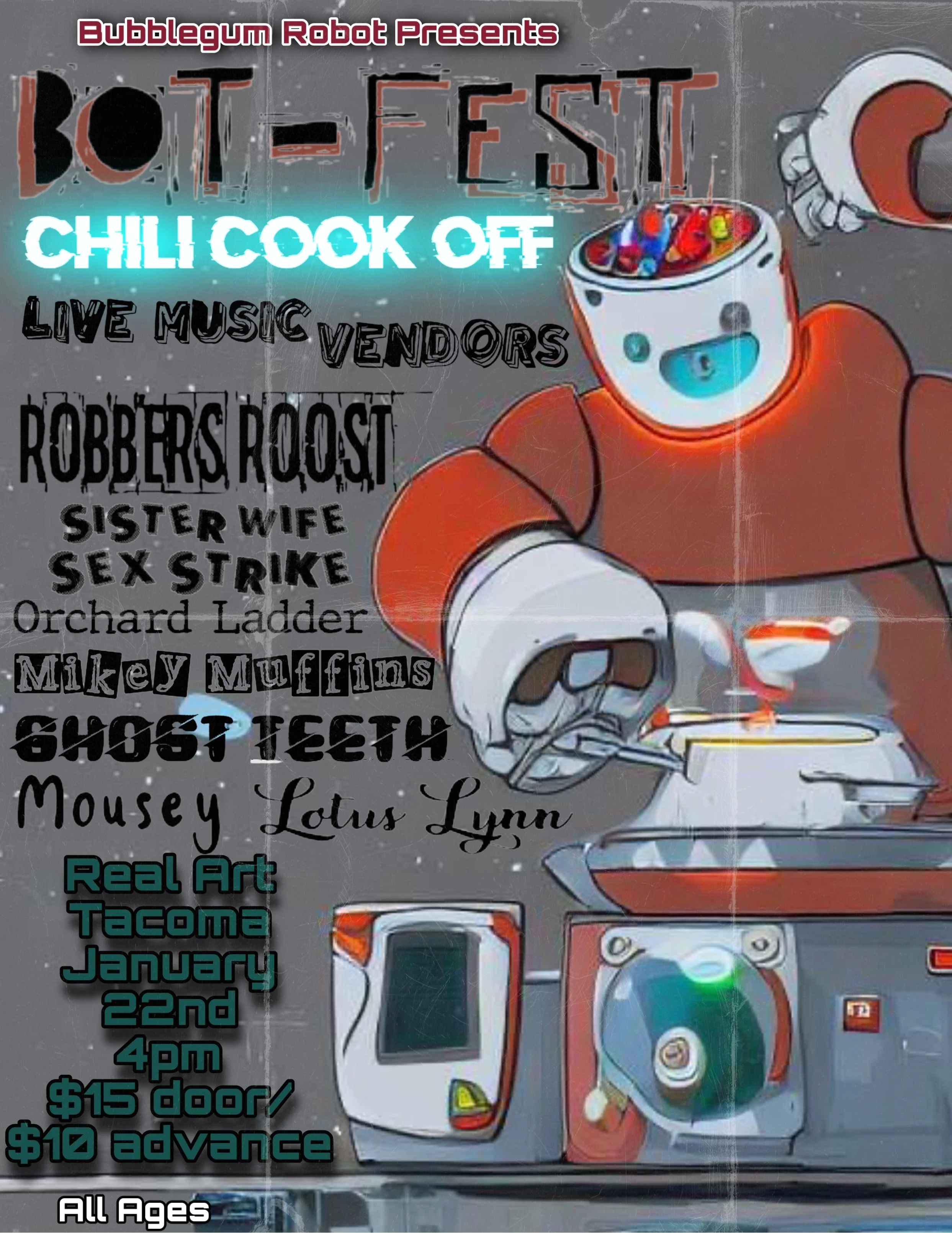 ****Reminder that Real Art is a 100% Drug & Alcohol free venue space. All alcoholic beverages must be consumed inside Beyond ThunderDome Cafe. We strive to maintain a safe, inclusive, and supportive community. Please consider the personal space you take up and respect those around you. Our venue is wheelchair accessible and has gender neutral bathrooms. Please ask if you have any questions. info@realarttacoma.com ****