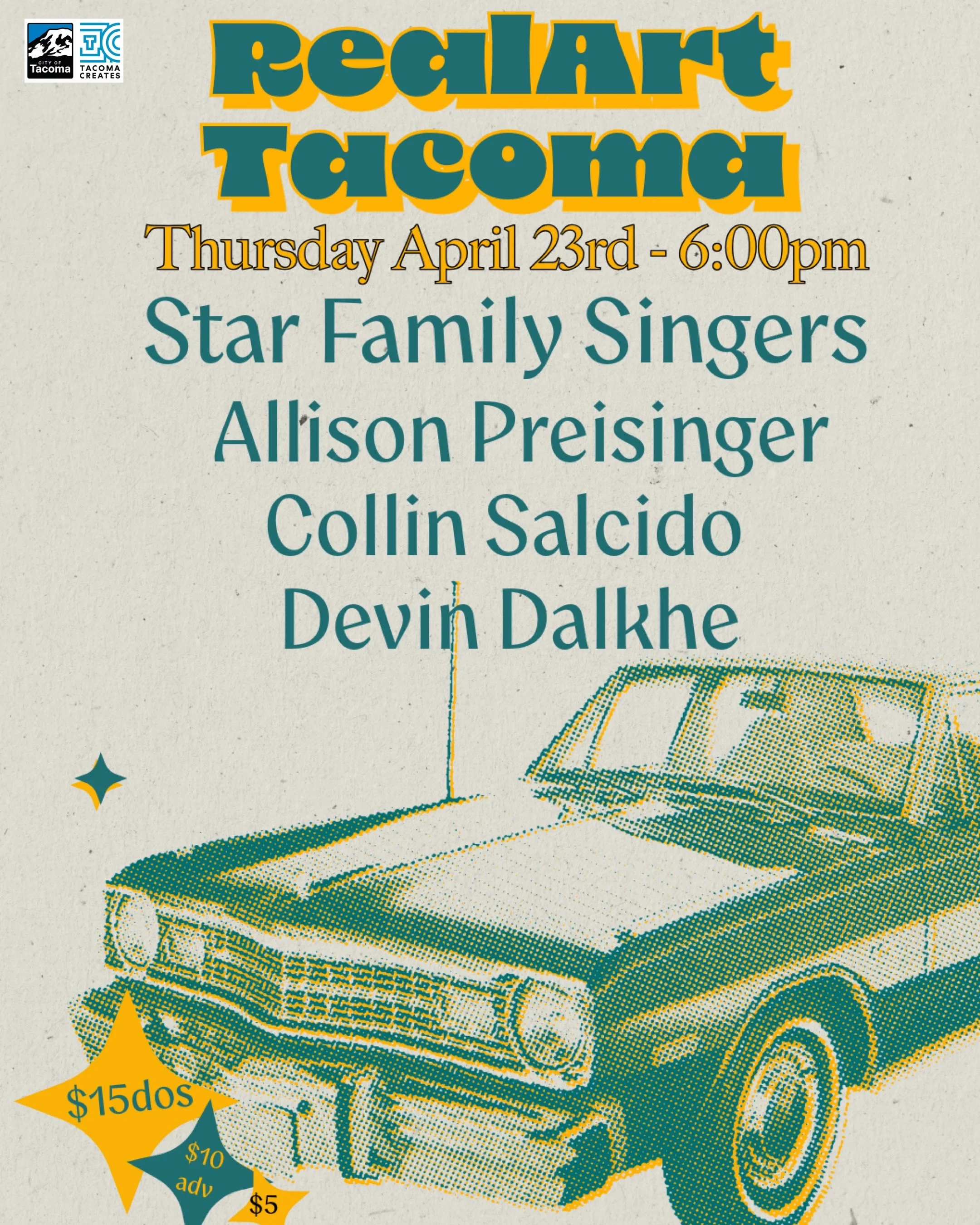*Reduced Door Ticket Prices are funded by Tacoma Creates. Get more info about Tacoma Creates and how its helping Real Art Tacoma HERE. * **Refunds are only issued if an event is being rescheduled or cancelled.** ***Real Art Tacoma is a 100% Drug & Alcohol free venue space. All alcoholic beverages must be consumed inside Beyond ThunderDome Café. We strive to maintain a safe, inclusive, and supportive community.*** ****Our venue is wheelchair accessible and has gender neutral bathrooms. Please ask if you have any questions. info@realarttacoma.com **** *****General Admission is for entrance to event, events are standing room only unless specified. Reasonable accommodations for seating are available; but limited please let us know upon arrival or email us at Management@realarttacoma.com. There is no guarantees that one will receive seating for an event unless purchased tickets specifically stated so or reaching out to staff..*****