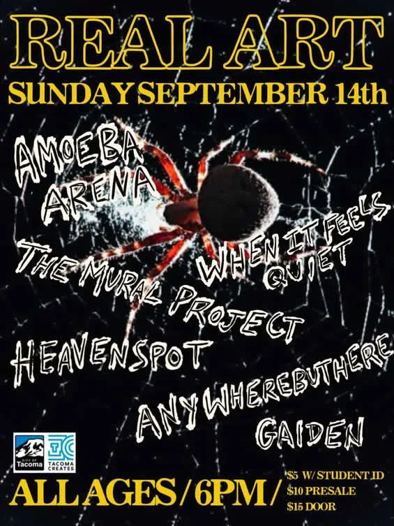 *Reduced Door Ticket Prices are funded by Tacoma Creates. Get more info about Tacoma Creates and how its helping Real Art Tacoma HERE. * **Refunds are only issued if an event is being rescheduled or cancelled.** ***Real Art Tacoma is a 100% Drug & Alcohol free venue space. All alcoholic beverages must be consumed inside Beyond ThunderDome Café. We strive to maintain a safe, inclusive, and supportive community.*** ****Our venue is wheelchair accessible and has gender neutral bathrooms. Please ask if you have any questions. info@realarttacoma.com **** *****General Admission is for entrance to event, events are standing room only unless specified. Reasonable accommodations for seating are available; but limited please let us know upon arrival or email us at Management@realarttacoma.com. There is no guarantees that one will receive seating for an event unless purchased tickets specifically stated so or reaching out to staff..*****