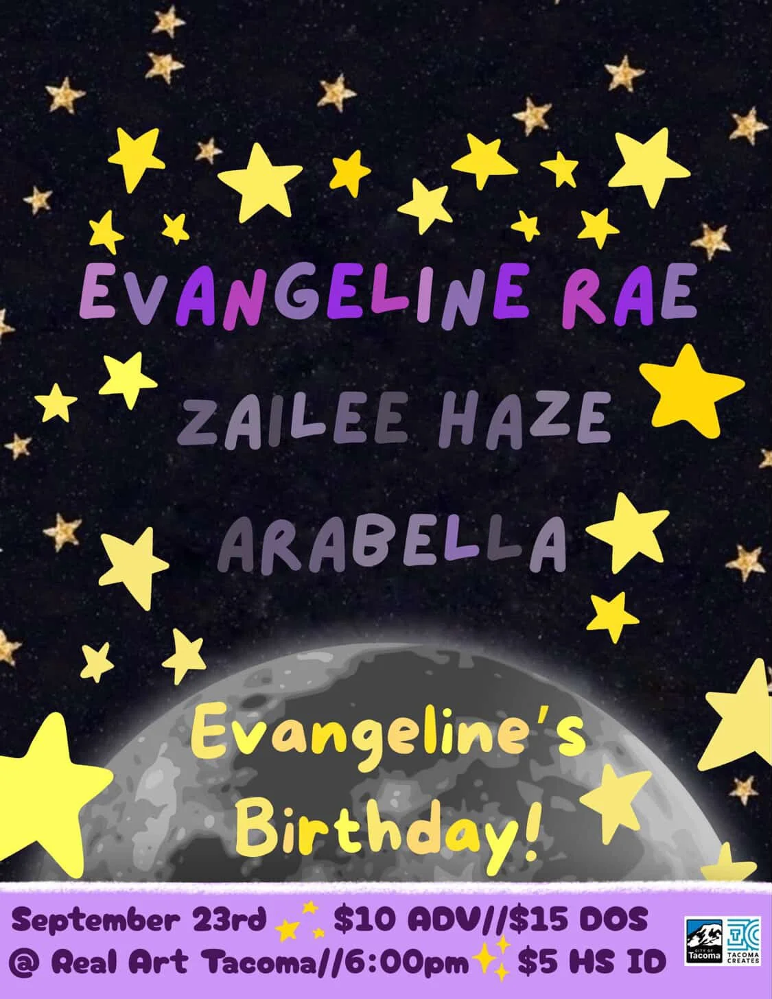 *Reduced Door Ticket Prices are funded by Tacoma Creates. Get more info about Tacoma Creates and how its helping Real Art Tacoma HERE. * **Refunds are only issued if an event is being rescheduled or cancelled.** ***Real Art Tacoma is a 100% Drug & Alcohol free venue space. All alcoholic beverages must be consumed inside Beyond ThunderDome Café. We strive to maintain a safe, inclusive, and supportive community.*** ****Our venue is wheelchair accessible and has gender neutral bathrooms. Please ask if you have any questions. info@realarttacoma.com **** *****General Admission is for entrance to event, events are standing room only unless specified. Reasonable accommodations for seating are available; but limited please let us know upon arrival or email us at Management@realarttacoma.com. There is no guarantees that one will receive seating for an event unless purchased tickets specifically stated so or reaching out to staff..*****
