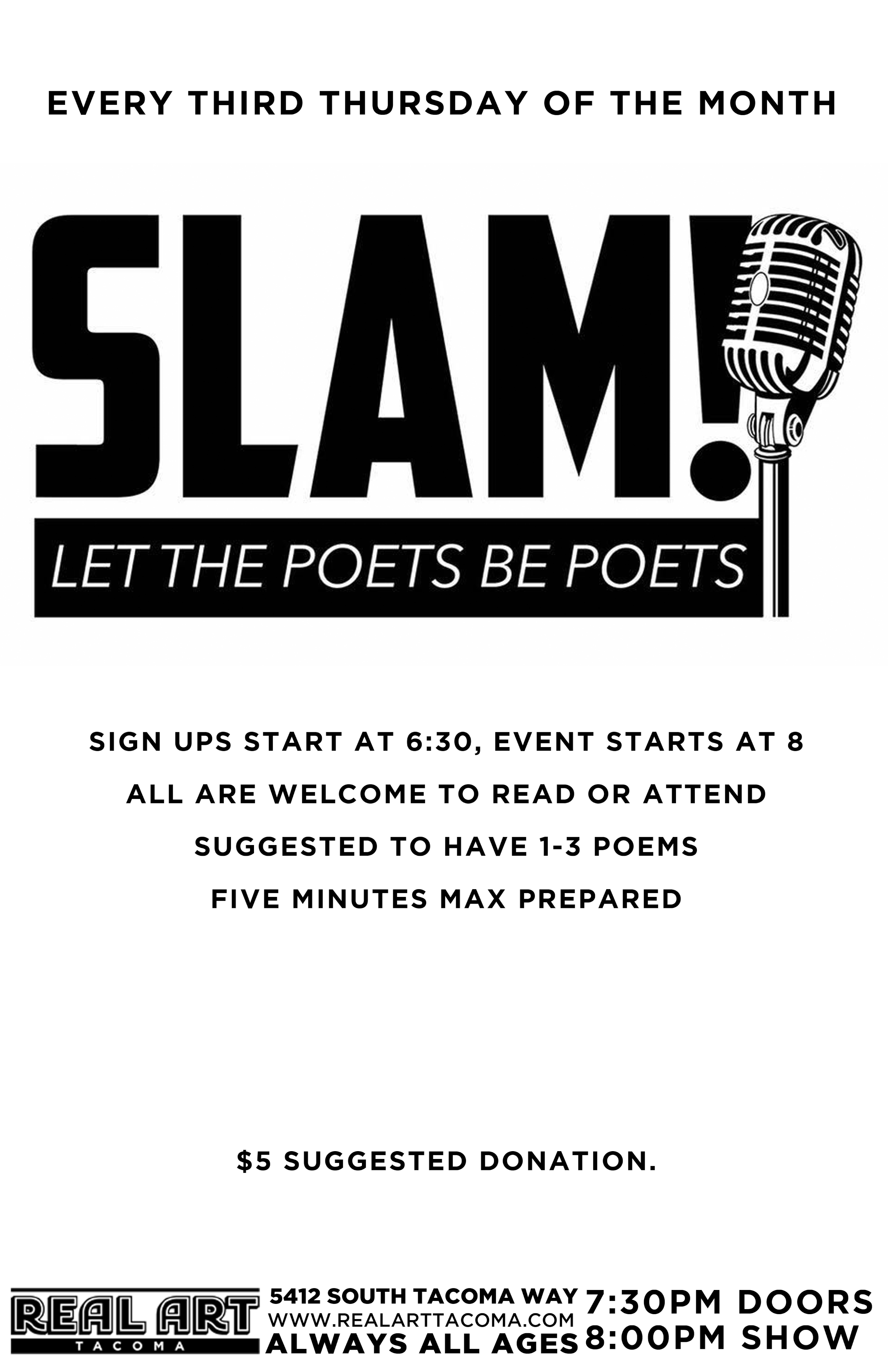 **** Reminder that Real Art is a 100% Drug & Alcohol free space. We have awesome all volunteer staff and we strive to maintain a safe, inclusive and supportive community. Please consider the personal space you take up and respect those around you. Our venue is wheelchair accessible. Please ask if you have any questions. info@realarttacoma.com ****