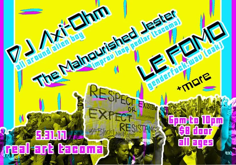 All ages Queer Dance Party! ****** w/ LE FOMO, DJ AXI-OHM, The Malnourished Jester + DJ Lif3l3ss SKRAMz Wednesday, May 31, 2017 7:00 PM 10:30 PM 19:00 22:30 Google Calendar ICS Real Art Presents:LE FOMO (oakland)DJ AXI-OHMTHE MALNOURISHED JESTERDJ LIF3L3SS SKRAMZ