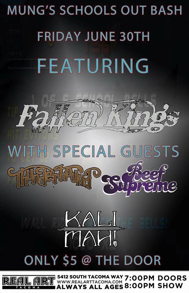 FALLEN KINGS, Thunder Hound, Beef Supreme, Kali Mah Friday, June 30, 2017 7:00 PM 11:00 PM 19:00 23:00 Google Calendar ICS Mung's End of School Bash!FALLEN KINGSTHUNDER HOUNDBEEF SUPREMEKALI MAH